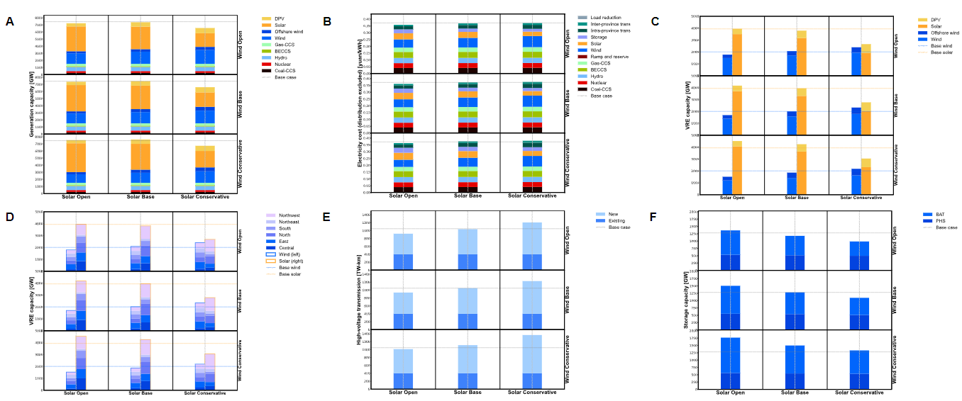 为评估土地利用政策严格程度对于相关结果的影响,研究还分别针对风电和集中式光伏的可建设潜力设计了高、中、低三个情景,形成3×3共计九种情景。模型结果显示,当可供集中式光伏建设用地假设更加保守时,分布式光伏将在一定程度上替代集中式光伏装机;在高电力需求和农业大省,能源与粮食的用地竞争更加明显,一些东部省份将利用几乎所有可供集中式光伏建设的土地。相比之下,不同土地利用假设对风电装机结果影响有限。图5显示了不同土地利用情景下的装机容量(子图A)、平均供电成本(子图B)、风光装机(子图C)、分电网区域装机(子图D)、跨省传输通道容量(子图E)与储能装机容量(子图F)情况。