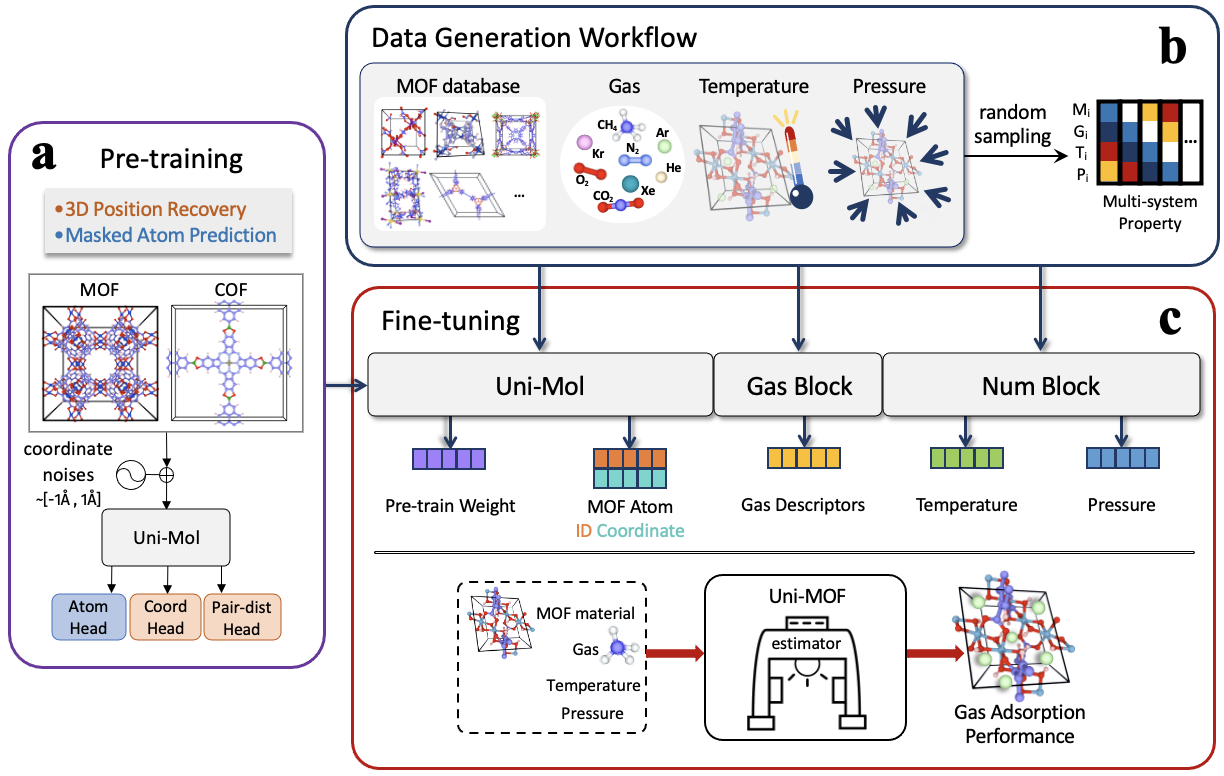 图1.Uni-MOF框架示意图。(a)预训练阶段,(b)数据生成工作流,(c)微调阶段