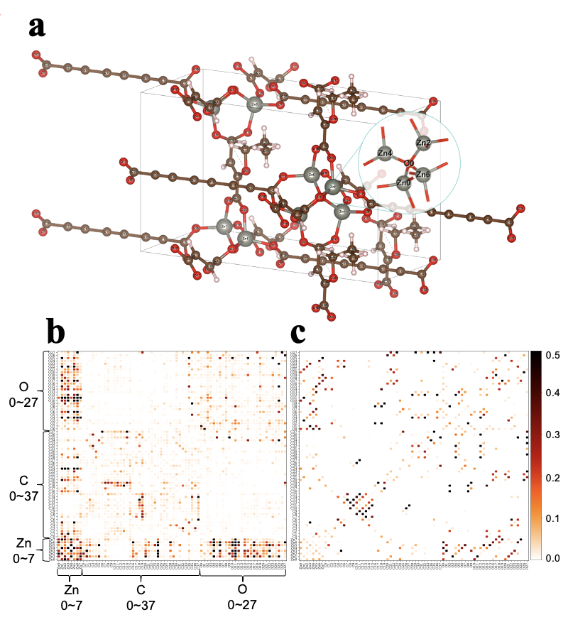 图3.(a)hMOF-5004238结构示意图,Transformer的多头注意机制下(b)Head-10和(c)Head-18中的原子相互作用关系热图