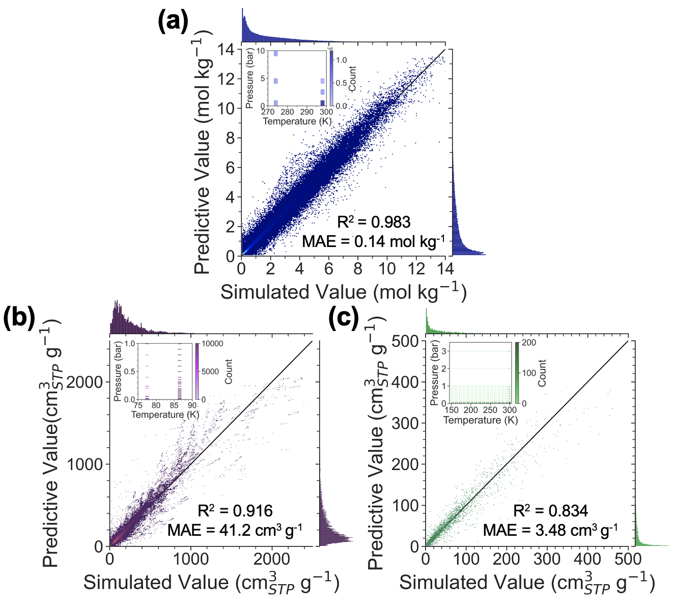 图2.气体吸附量预测值与模拟值的相关性。(a)hMOF_MOFX-DB(mol/kg),(b)CoRE_MOFX-DB(cm3/kg),(c)CoRE_MAP-DB (cm3/kg)。子图是每个数据库的温度(K)和压力(bar)分布