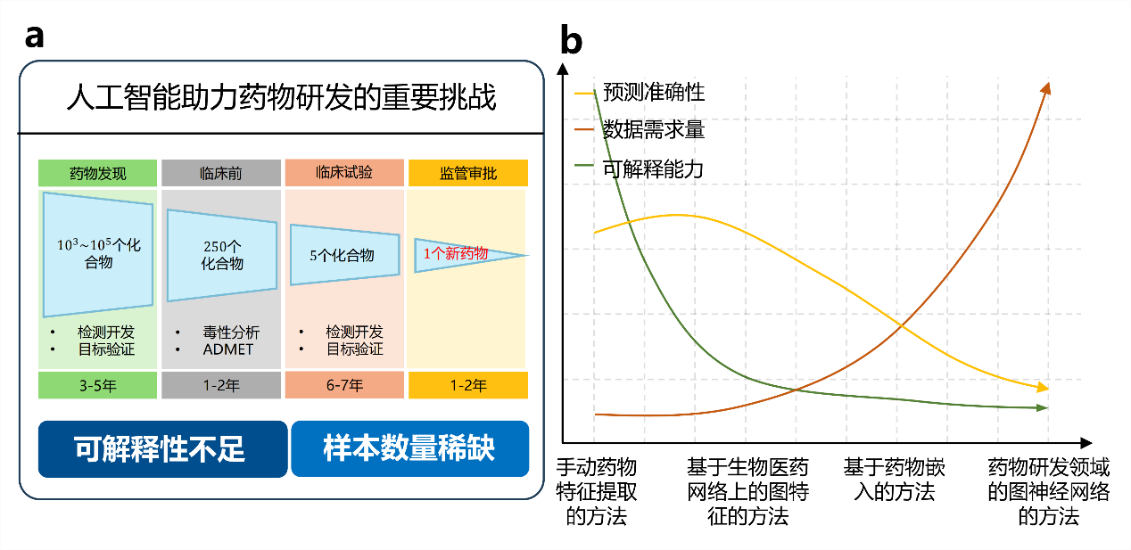 图1.(a)人工智能助力药物研发的重要挑战:可解释性不足和样本数量稀缺(b)现有的药物研发相关任务研究方法存在的局限