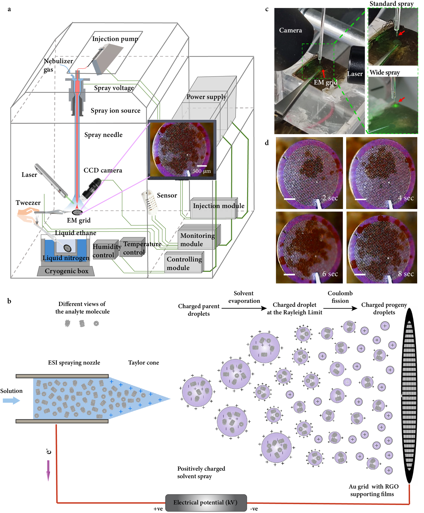 4月25日,米兰milan官方网站生命科学学院王宏伟课题组和精密仪器系欧阳证、周晓煜课题组在《自然·方法学》(Nature Methods)在线发表了题为“电喷雾辅助的冷冻电镜样品制备方法用以减轻界面吸附效应”(Electrospray-assisted cryo-EM sample preparation to mitigate interfacial effects)的研究论文。研究采用非变性质谱(Native mass spectrometry, native MS)中广泛使用的电喷雾电离(Electrospray ionization, ESI)技术,设计并搭建了一种新型冷冻样品制备装置ESI-cryoPrep(图1),成功实现了无需滤纸夹吸的冷冻样品制备,并获得了多种生物大分子近原子分辨率的三维结构。