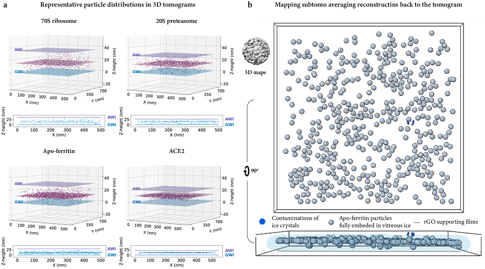 图2.ESI-cryoPrep方法制备的冷冻样品中蛋白质颗粒在断层成像中的代表性空间分布