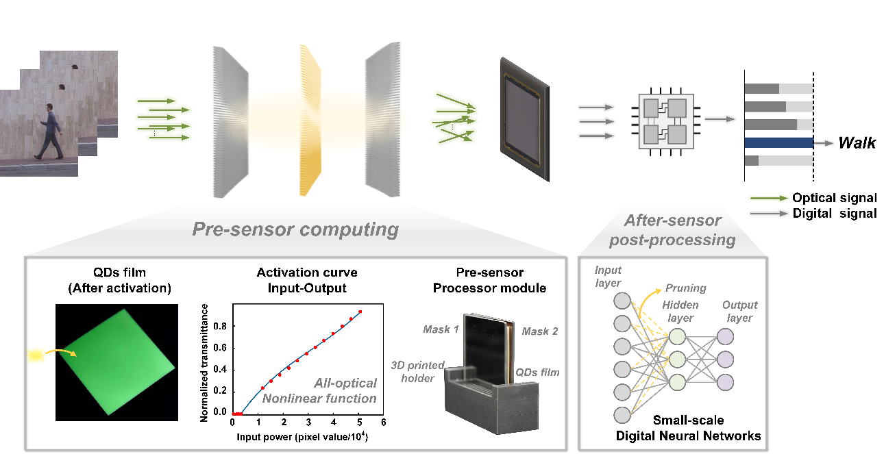 米兰新闻网7月30日电 在物联网时代,视觉图像传感器作为智能社会的关键设备,被嵌入到诸如移动通信终端、智能穿戴设备、汽车和工业机器等各种设备中。随着应用的不断扩展,对传感器的系统功耗、响应速度、安全性能等方面也提出了更高的要求。而在传统的“感传算”链路中,内存的访问速度和通信带宽逐渐成为了限制系统功耗及速度的主要瓶颈。将计算单元向传感单元靠近,使系统的近传感端拥有一定的数据处理能力,逐渐成为解决这一问题的有力途径。感前光计算相比于其他近感计算方式,具有高速、高带宽、低功耗的优势。然而,目前绝大部分光神经网络需要相干激光作为光源,硬件系统笨重复杂,且仅能完成线性运算,缺乏层间非线性激活,限制了感前光计算在边缘场景的应用。