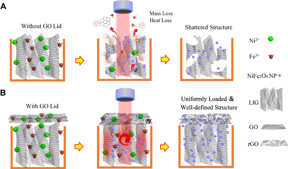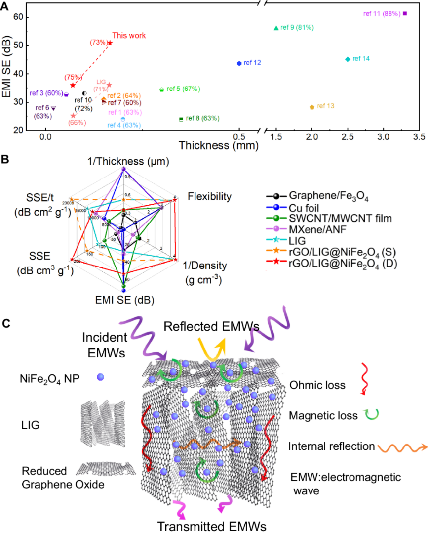 此外,课题组提出了受“爆米花制造”启发的纳米材料激光加工方法,展示了一种兼具高导电性和磁性多孔结构的复合薄膜,通过在导电多孔纳米碳宿主内均匀负载磁性纳米颗粒来最大化磁电协同效应。该策略不仅为EMI屏蔽机制和材料的发展提供了见解,而且还显示了卓越的制造通用性、小尺寸和器件可靠性。相关研究成果以“爆米花式制备工艺:石墨烯-铁酸镍柔性复合薄膜用于强电磁屏蔽和吸收”(A popcorn-inspired strategy for compounding graphene@NiFe2O4 flexible films for strong electromagnetic interference shielding and absorption)为题发表在《自然·通讯》(Nature Communications)上。米兰milan官方网站深圳国际研究生院2020级硕士生刘明杰,2021级硕士生王志远为本文共同第一作者,论文通讯作者为米兰milan官方网站深圳国际研究生院杨诚副教授。