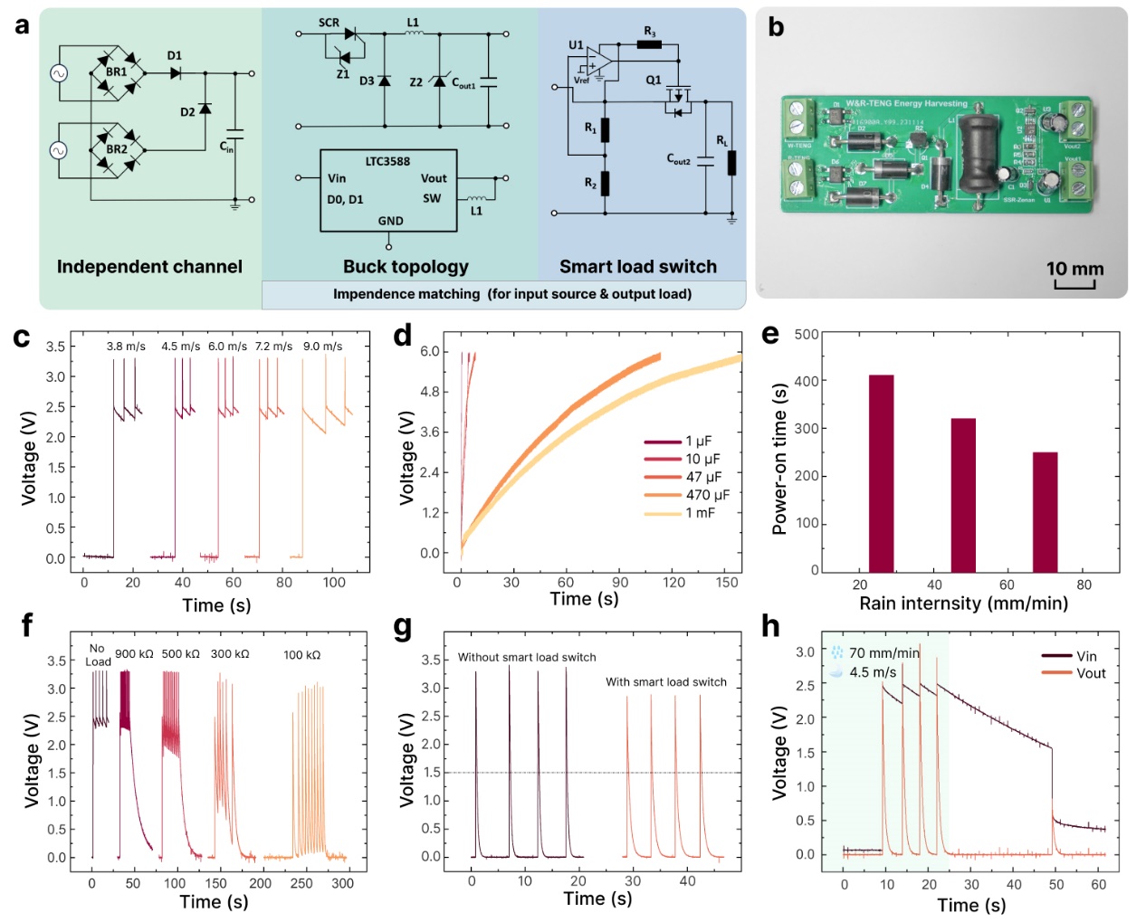 (a)电源管理电路(PMC)示意图;(b)PMC原型照片;(c)在不同风速下PMC启动过程的输出电压波形;(d)在70 mm/min降雨量下不同电容的电压充电曲线;(e)在不同降雨强度下的启动时间;(f)在4.5 m/s风速下PMC在不同负载下的输出电压波形;(g)在4.5 m/s风速和50 kΩ负载下,带和不带智能负载开关的PMC输出电压循环;(h)在70 mm/min降雨量和4.5 m/s风速下,20 kΩ负载时PMC的输入和输出电压