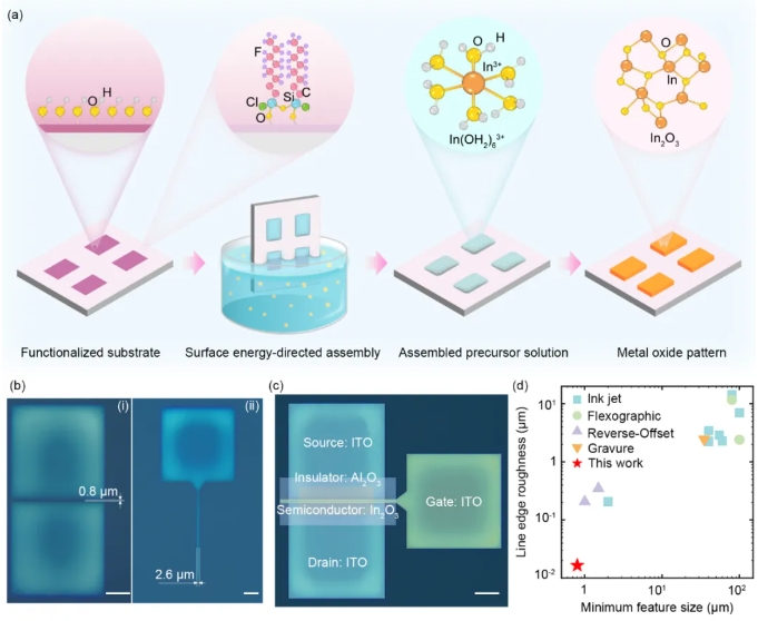 米兰新闻网8月14日电 金属氧化物薄膜晶体管(TFTs)因其在集成电路领域的广泛应用而备受瞩目。如何实现低成本且高精度的TFTs制造,已成为学术界和产业界共同关注的焦点。近日,米兰milan官方网站机械工程系路新春教授团队柴智敏副教授在基于表面能诱导定向组装的电子器件微纳制造领域取得进展。其提出一种基于湿度控制的“表面能导向组装”(surface energy-directed assembly,SEDA)工艺(图1),全溶液制备了分辨率800nm、线边缘粗糙度16nm的电子器件,边缘粗糙度优于目前印刷电子工艺两个数量级,为微纳制造开辟了一条高分辨率、高形状精度和低成本的新路径。