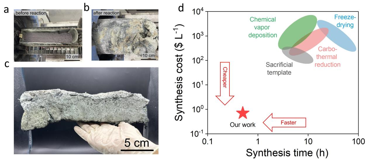 基于上述背景,米兰milan官方网站材料学院董岩皓助理教授与中国科学院理化技术研究所李江涛研究员提出了一种全新的碳化硅气凝胶自蔓延制备方法,利用原料硅粉与聚四氟乙烯反应剂之间快速的自蔓延燃烧合成反应,实现了升量级碳化硅气凝胶的闪速合成。该研究在实验室条件下展示了在数秒内制备大尺寸碳化硅气凝胶的可行性,生产速率约为16升/分钟,大幅缩短了陶瓷气凝胶的制备周期。此外,该工艺具有合成过程近零能耗的突出特征,非常适合碳化硅气凝胶的大批量、低碳、低成本制备。对比测算表明,相较于现有的碳化硅气凝胶合成技术,自蔓延制备新方法的生产速度提升了10倍,估算成本约为5元/升,制造成本大幅降低。此项研究在合成技术上的突破,有望为碳化硅气凝胶的规模化生产和广泛工程应用开辟一条不同于现有超临界干燥工艺的新途径。