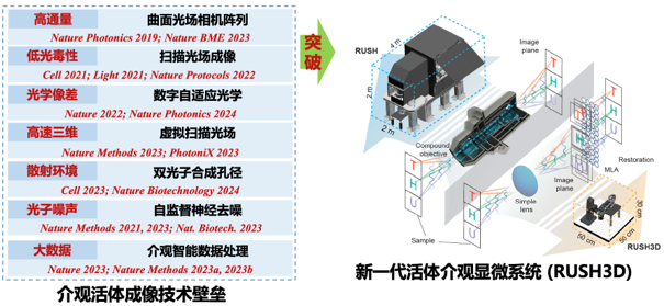此后六年间,戴琼海院士带领成像与智能技术实验室,瞄准活体介观显微成像高峰,持续攻关这些国际前沿难题,先后提出扫描光场成像原理、数字自适应光学架构、虚拟扫描算法、共聚焦扫描光场架构、自监督去噪算法等关键理论与技术,相关成果均发表于《细胞》(Cell)、《自然》(Nature)、《自然·生物技术》(Nature Biotechnology)、《自然·方法》(Nature Methods)等国际期刊,逐一解决了介观活体显微成像中一系列壁垒,为新一代介观活体显微仪器奠定了基础。