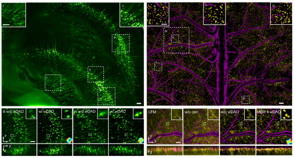 计算成像是改变了传统光学成像“所见即所得”的设计理念。利用计算编码、计算采集等多维尺度计算架构,实现对高维光场的超精细感知与融合,为机器设计更好的感知系统,从而突破传统光学成像的一系列物理瓶颈。然而这条创新之路同样充满荆棘,RUSH3D系统集成了团队过去十多年来一系列的理论和关键技术创新,才真正实现了整体性能的颠覆性提升。针对二维传感器难以捕捉三维动态变化的难题,团队提出了扫描光场成像原理,能够在实现轴向400微米范围的高速三维成像的同时,将激光照射对细胞的损伤降低了数百倍。针对活体组织复杂环境引起的光学像差降低系统成像分辨率与信噪比这一难题,团队提出了基于波动光学的数字自适应光学架构,无需在光学系统中增加额外波前传感器或者空间调制器,在后端即可完成大视场多区域自适应光学像差矫正,从而提升大视场复杂环境三维成像的空间分辨率以及信噪比。这一设计使得仅需常规尺寸物镜,就能有效克服空间非一致的系统像差和样本像差难题,实现了全视场内均一高空间分辨率的十亿像素成像,显著降低介观成像系统尺寸与成本,使得高分辨活体介观显微成像系统变得更加广泛可及。除此之外,活体荧光成像中背景荧光严重影响了成像信背比,RUSH3D采用多尺度去背景算法实现背景信号和在焦信号的分离,精准滤除散焦背景,从而提升成像信背比,恢复淹没在荧光背景中的荧光信号。进一步与共聚焦扫描光场融合,将能在具备高通量介观观测能力的同时,实现共聚焦成像保真度。