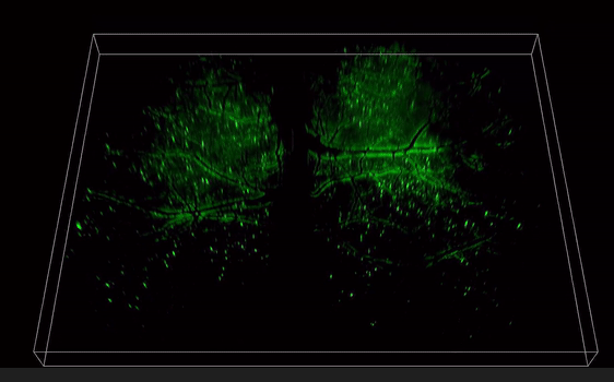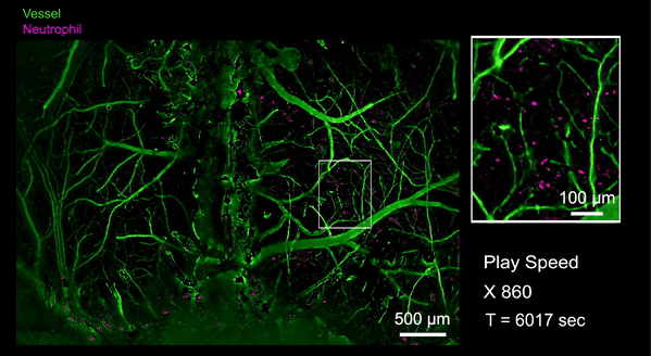 跨时空的多尺度成像能力使得RUSH3D极大提升了实验效率。例如,药物筛选实验能够在单次实验中显著提高效率,免去多次试验需求。同时,由于RUSH3D可以提供足够数据进行统计分析,跨个体差异可以在一次实验中得到有效缓解。此外,诸如肿瘤转移等稀有事件,在RUSH3D的观察中将不再是偶发事件,而是常规可见现象,成百上千倍地提升了活体生物发现的效率。凭借其低光毒性三维观测的优势,该系统还能够同时观察到细胞间的长距离通信,并通过长时间追踪数百万个细胞,揭示集体细胞行为的物理规律和功能涌现的机制,例如能够捕捉从肿瘤发生开始到免疫应答、肿瘤生长的全过程,揭示肿瘤产生的完整免疫活化反应。作为RUSH3D在医学领域的初探,研究人员首次观测到了急性脑损伤(脑震荡等)后整个大脑皮层范围内的中性粒细胞迁移活动。当小鼠的脑部受到撞击以后,大量的中心粒细胞从血管周边非血管区域流出进入脑实质,也有极罕见的细胞从脑实质回流到血管里,这意味着有些细胞可能通过类淋巴系统进入脑实质,并且会流回血管中将信息传递到生物体的其他地方。通过国际首次捕捉对脑损伤修复过程单细胞水平的免疫反应,有助于开发特定疗法避免急性脑损伤后组织水肿带来的脑功能缺失难题,并为更广泛的脑疾病等医学问题提供新视角。