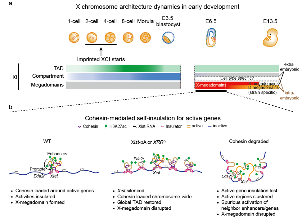 米兰milan官方网站生命科学学院颉伟实验室和合作者前期围绕染色体三维结构在哺乳动物生殖和胚胎发育过程中的变化规律和功能进行了一系列研究,包括精子发生、卵子发生、着床前胚胎、着床后胚胎和核移植过程等。然而,染色体三维结构在雌性胚胎发育早期X染色体失活过程中的动态变化过程、机制和功能仍不清楚。