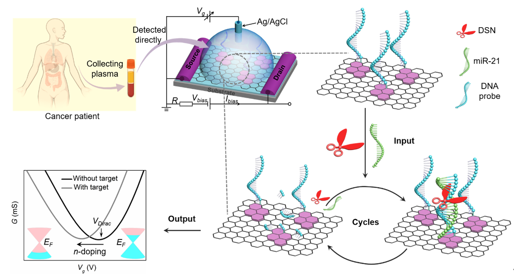 相关研究成果以“双链特异性核酸酶辅助的石墨烯场效应晶体管生物传感器:一种无需预扩增的癌症相关miRNA检测新平台”( Duplex-specific-nuclease-assisted graphene field-effect transistor biosensor: a novel platform for preamplification-free detection of cancer related miRNA”)为题,于9月26日在线发表于《碳》(Carbon)。
