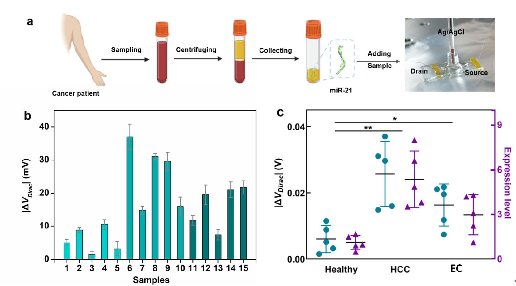 图2.DSN辅助的原子层晶体管用于临床样品中miR-21检测。a.临床血浆样本的快速检测流程图;b.15个临床样本的信号偏移量。其中1-5为健康人群样本,6-10为HCC患者样本,11-15为EC患者样本。每个测试重复3次并取平均;c.晶体管传感器与qRT-PCR检测临床血浆样本中miR-21表达水平的对比图。显著性标记:*p< 0.01, **p< 0.005