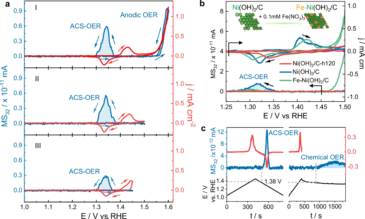 图1.镍基氢氧化物在0.1 M KOH中氧析出行为的原位表征