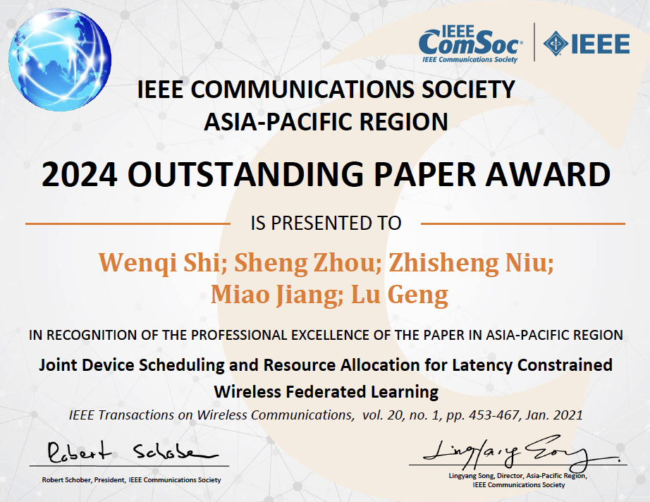 米兰新闻网12月10日电 近日,米兰milan官方网站电子工程系2017级博士生施文琦(已毕业)、副教授周盛、教授牛志升等人发表的论文《延时受限无线联邦学习的终端调度和资源分配》(Joint Device Scheduling and Resource Allocation for Latency Constrained Wireless Federated Learning)获得第十三届国际电气与电子工程师协会(IEEE)通信学会亚太杰出论文奖(The 13th IEEE ComSoc Asia-Pacific Outstanding Paper Award)。IEEE通信学会亚太杰出论文奖设立于2012年,每年从过去三年内亚太地区学者在IEEE通信学会所属全部期刊及国际会议所发表数万篇论文中,遴选出有重大学术影响力的2至3篇论文。