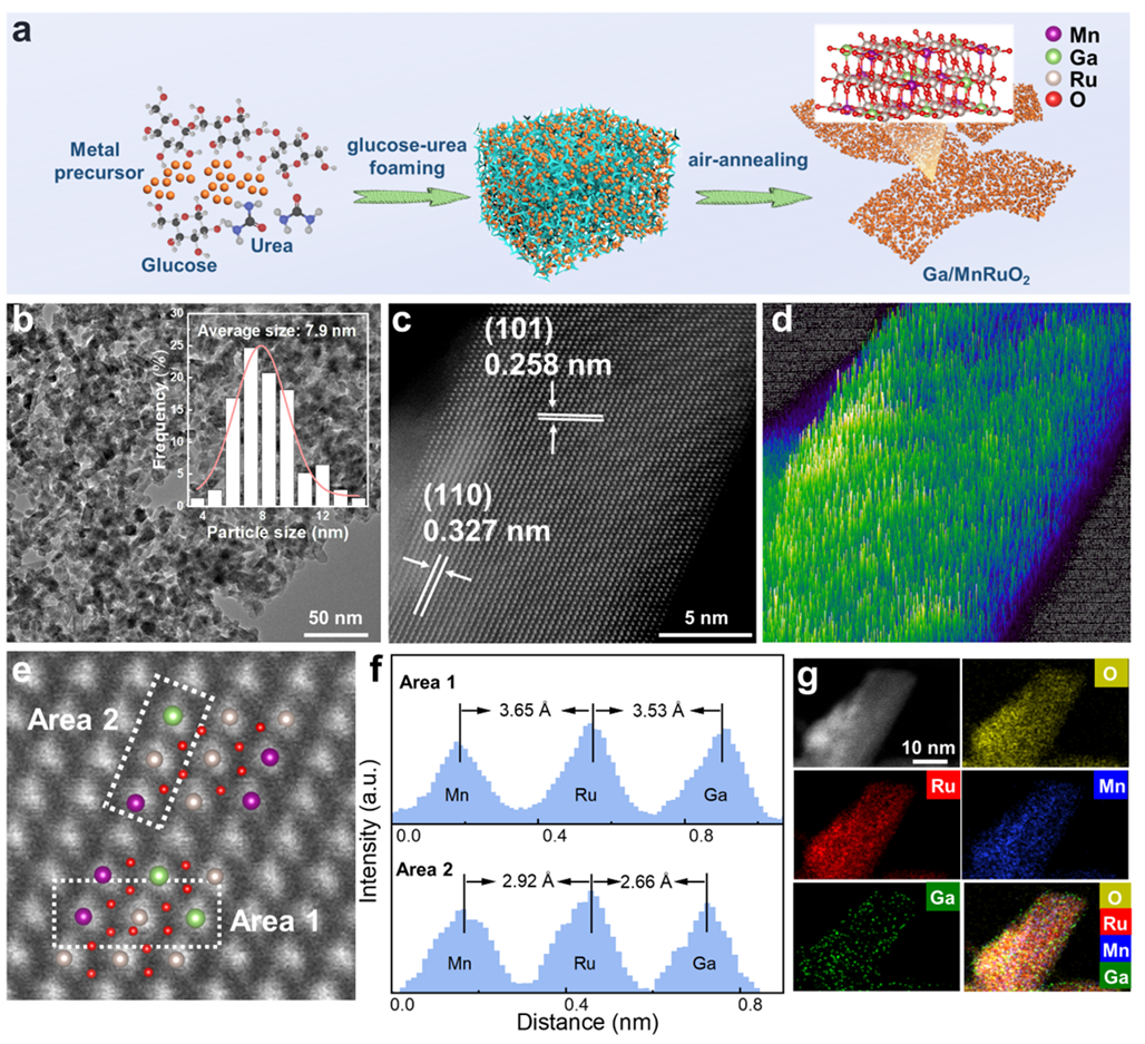 课题组基于简单的葡萄糖-尿素鼓泡法(图1)开发了一种双向调控策略,通过同时在RuO2中引入元素Ga和活性位点Mn,利用Ga从原子水平上对双活性位点Ru和Mn的价态结构进行优化,突破了传统双位点活性与稳定性之间的限制。研究人员结合实验和理论分析证实了Ga的引入造成了双活性位点Mn和Ru上的电子/电荷再分布,优化了Mn和Ru的价态结构,通过调控反应中间产物*O/*OH在活性位点上的吸附行为降低了ORR和OER反应的能垒。研究人员所开发的Ga/MnRuO2催化剂表现出优异的双功能催化性能(图2),其电位差(ΔE)仅为0.605V,显示了优异的催化活性,其中ORR性能经过30万圈加速测试之后衰减仅为18mV。将该催化剂与100篇近期的双功能催化剂进行对比,其综合性能优于大部分催化剂。