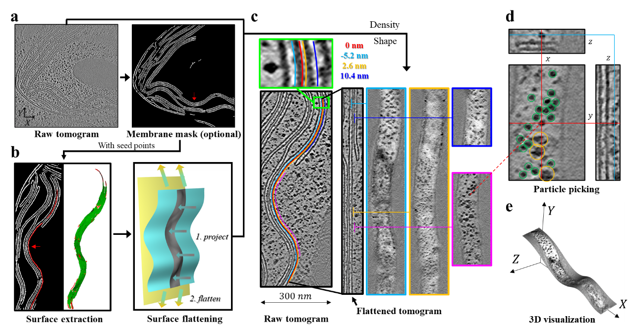 米兰新闻网1月13日电 冷冻电子断层成像(cryo-electron tomography,cryoET)技术、冷冻聚焦离子束(cryo-focused ion beam,cryoFIB)样品减薄技术和子断层平均技术(sub-tomogram averaging,STA)的进步推动了生物大分子在细胞中的原位结构测定,对于研究膜蛋白结构及其在细胞环境中的相互作用具有重要意义。断层扫描图像(tomogram)是三维图像,但由于低信噪比和细胞内拥挤的环境,当前的观察方法仍主要依赖查看tomogram中的二维截面。然而,细胞中的膜结构通常呈弯曲形态,这使得通过二维截面难以直接观察膜表面蛋白的分布。同时,膜信号强烈的衬度也会干扰膜蛋白的识别,增加原位观察和结构解析的难度。