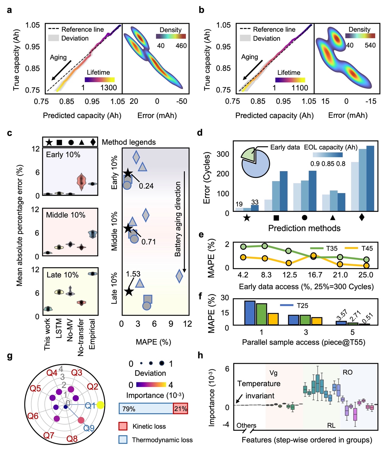 本研究所提出的物理信息学习模型分为三个步骤:首先,用可解释特征工程表达电池多维电化学过程;其次,用早期电化学过程数据推演后期尚未建立的电化学状态;最后,用推演后的电化学状态进行电池衰减曲线预测。实验采用多源域自适应设置(25℃和55℃数据可用)并在35℃和45℃温度下预测,利用早期循环数据即可实现准确的全寿命衰减曲线预测。