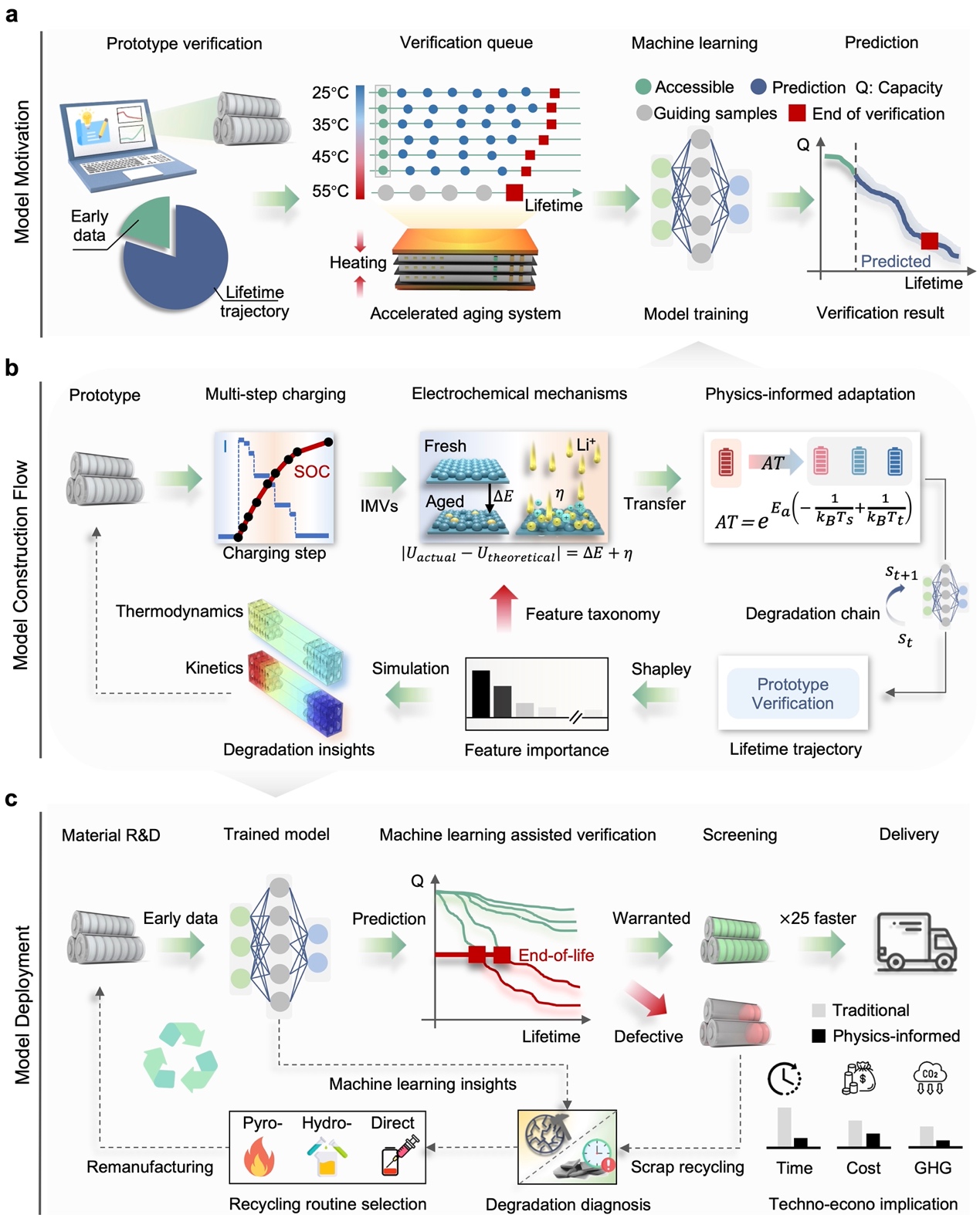 在电池制造领域,传统的容量校准方法在原型验证时需耗费大量时间。同时,制造的不一致性和电池老化的多样性,使得电池原型的性能评估变得极为复杂。为此,米兰milan官方网站深圳国际研究生院张璇、周光敏、李阳副教授团队与合作者提出了一种基于物理信息学习的电池衰减轨迹早期预测方法。该方法通过计算热力学和动力学参数,并将其关联至未来状态变化,从而实现对电池整个衰减轨迹的早期预测。与传统方法相比,该方法仅利用电池原型的早期循环数据(50次循环,占总寿命4%),即可达成95.1%全寿命平均预测准确率,将原型验证速度提升了至少25倍。