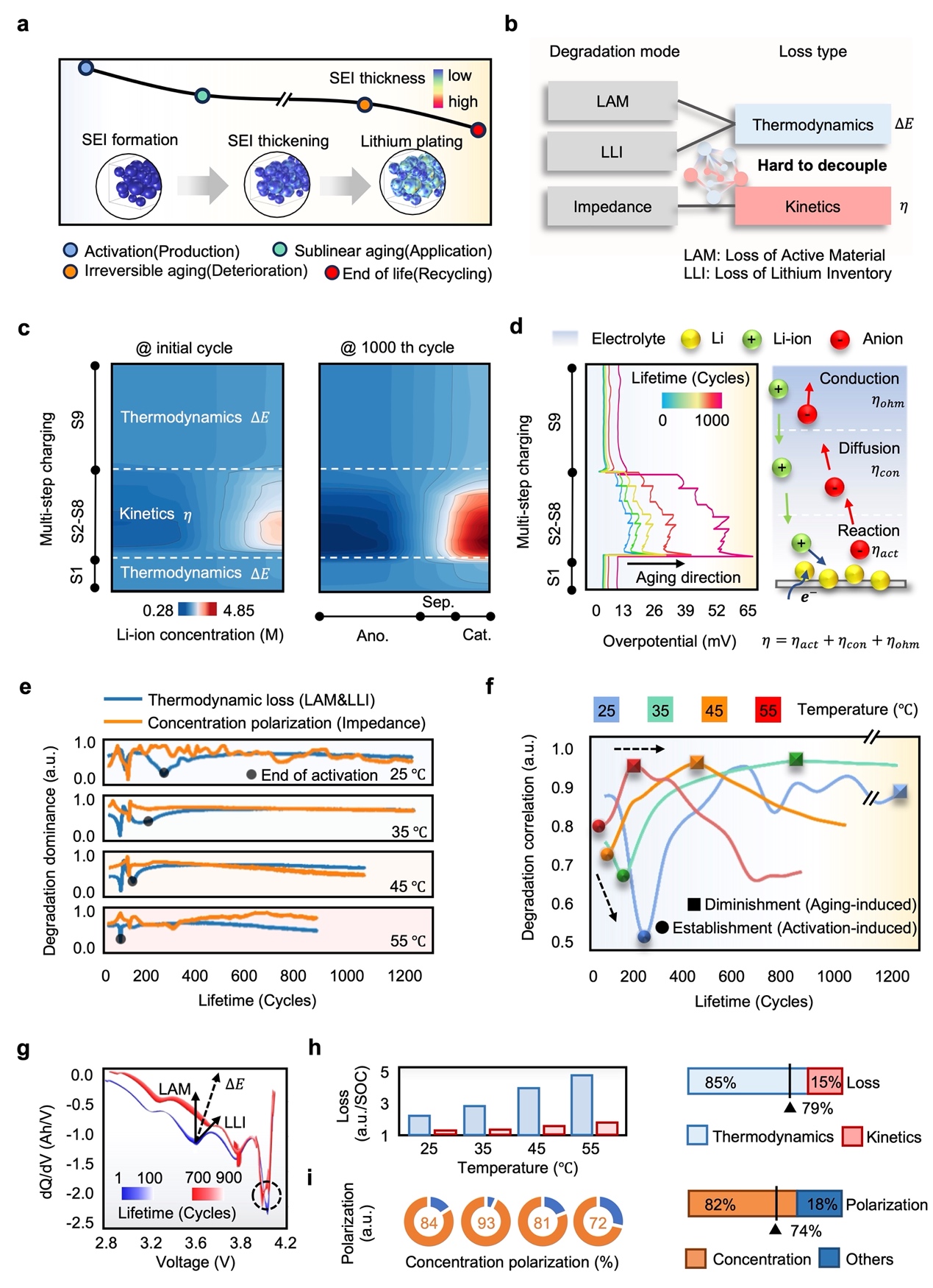 团队通过数值模拟确认了多阶段充电方式在表达热力学和动力学衰减过程的电化学原理依据,并通过物理信息学习模型的特征重要性分析,发现了热力学和动力学衰减在电池总衰减比例上吻合。这说明,所提出的模型可以通过结合电化学原理和可获取的电流和电压信号表达电化学过程,从而实现非侵入式的电池衰减曲线预测。