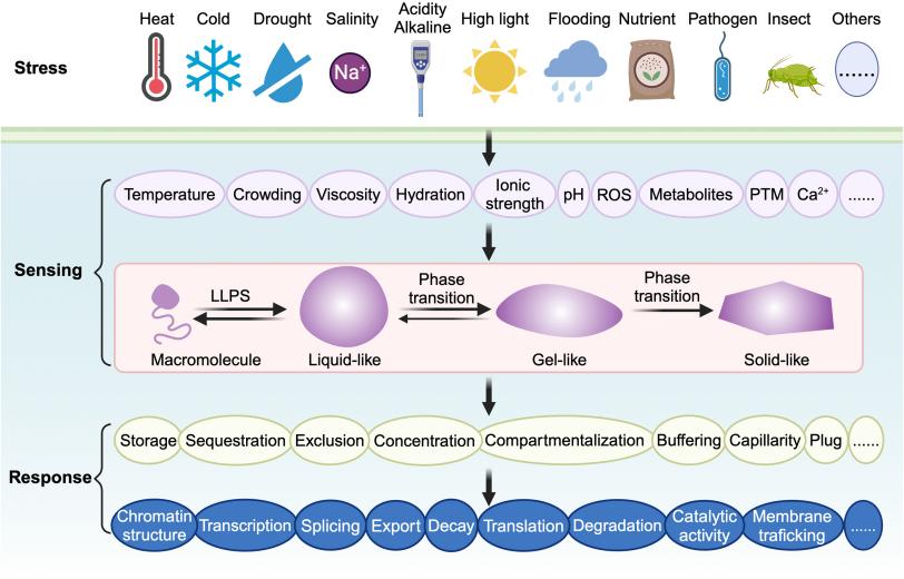 图1.生物分子凝聚体在胁迫感知与响应中的作用