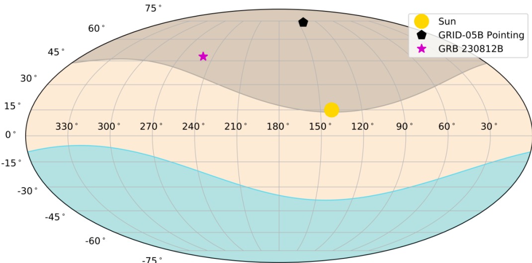 同时,GRB 230812B是迄今为止第三明亮的爆发,而得益于观测角度与适宜的有效面积,“天格计划”的5号卫星载荷(GRID-05B)是唯一观测到该爆发完整未饱和观测数据的伽马暴探测器,亦使得GRB 230812B成为首个“以‘天格计划’数据为主导”完成科学分析的伽马暴。