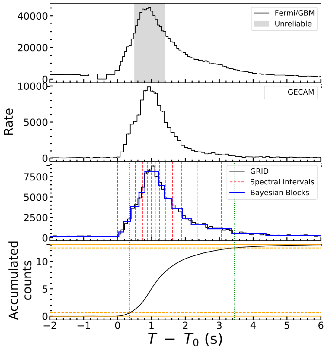 伽马暴通常在高能段具有极高亮度,而GRB 230812B在为迄今为止众多伽马暴样本中第三明亮的爆发,导致部分正对它的探测器在观测时出现了数据饱和的情况。然而,得益于GRID-05B的观测角度与适宜的有效面积,天格探测器是唯一观测到该爆发完整未饱和观测数据的伽马暴探测器(图3),这也使得GRB 230812B成为首个“以‘天格计划’数据为主导”展开分析的伽马暴。
