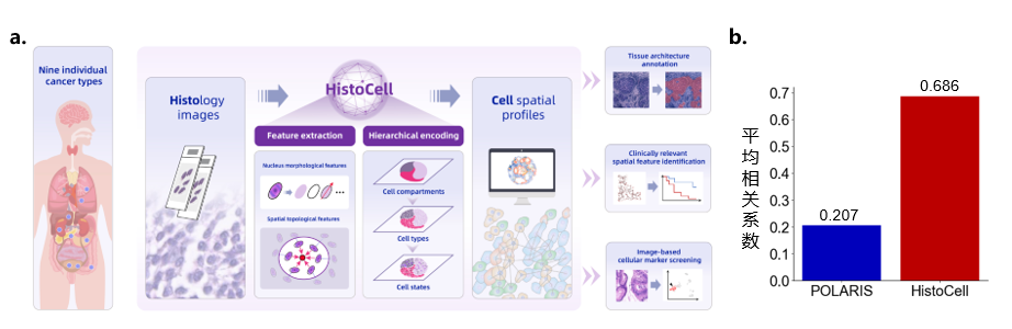 图2.HistoCell算法框架(a)及其对肿瘤病理影像相关细胞类型信息的预测精度(b)