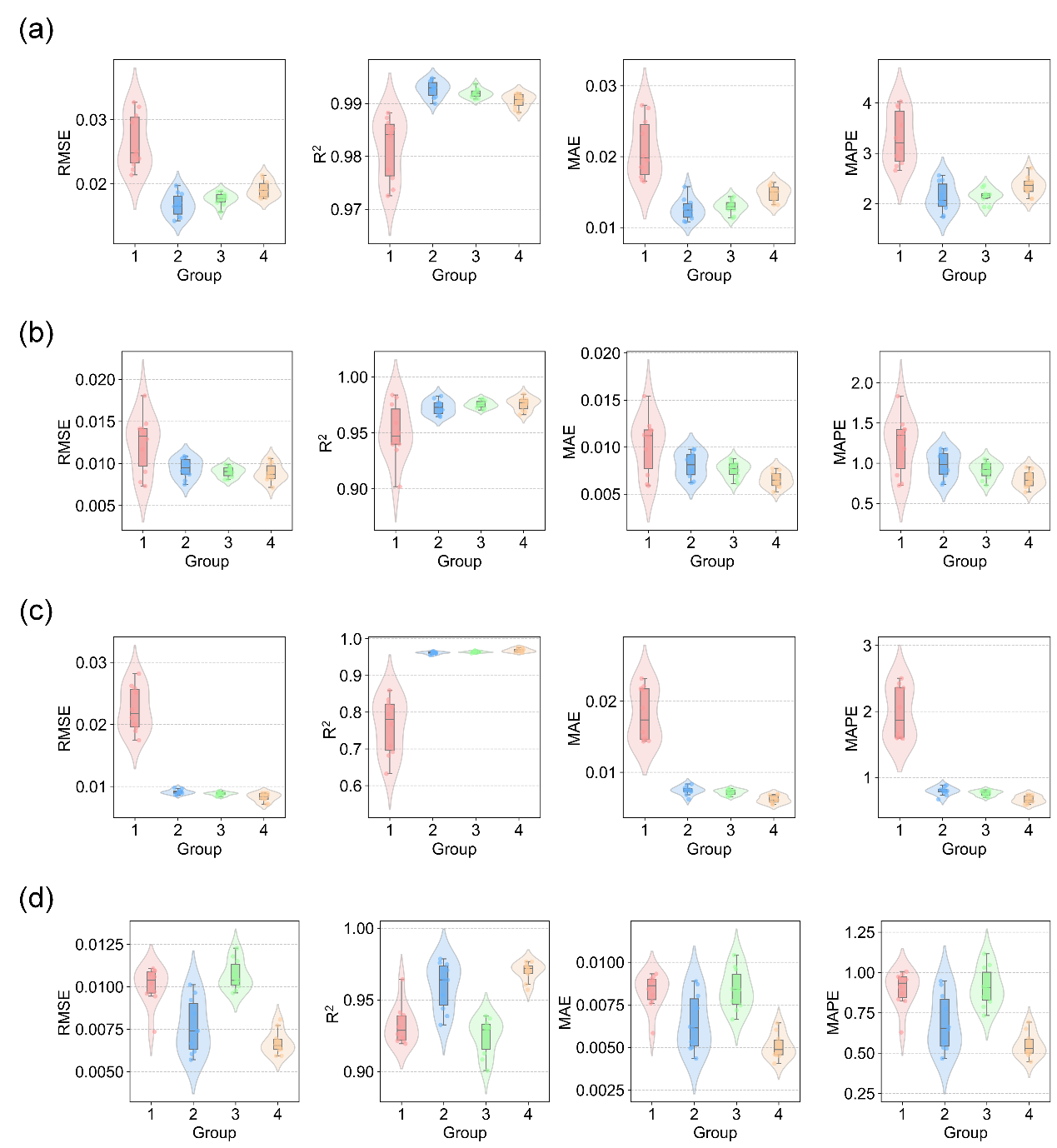 图3.QCNN与其他模型的误差分布:图(a)、(b)、(c)、(d)表示四个电池数据集的误差分布概率密度图。每个图由四个子图组成,代表四项评估指标:RMSE、R²、MAE和MAPE。每个图中的四种颜色表示四种SOH估计模型:MLP、CNN、LSTM和QCNN