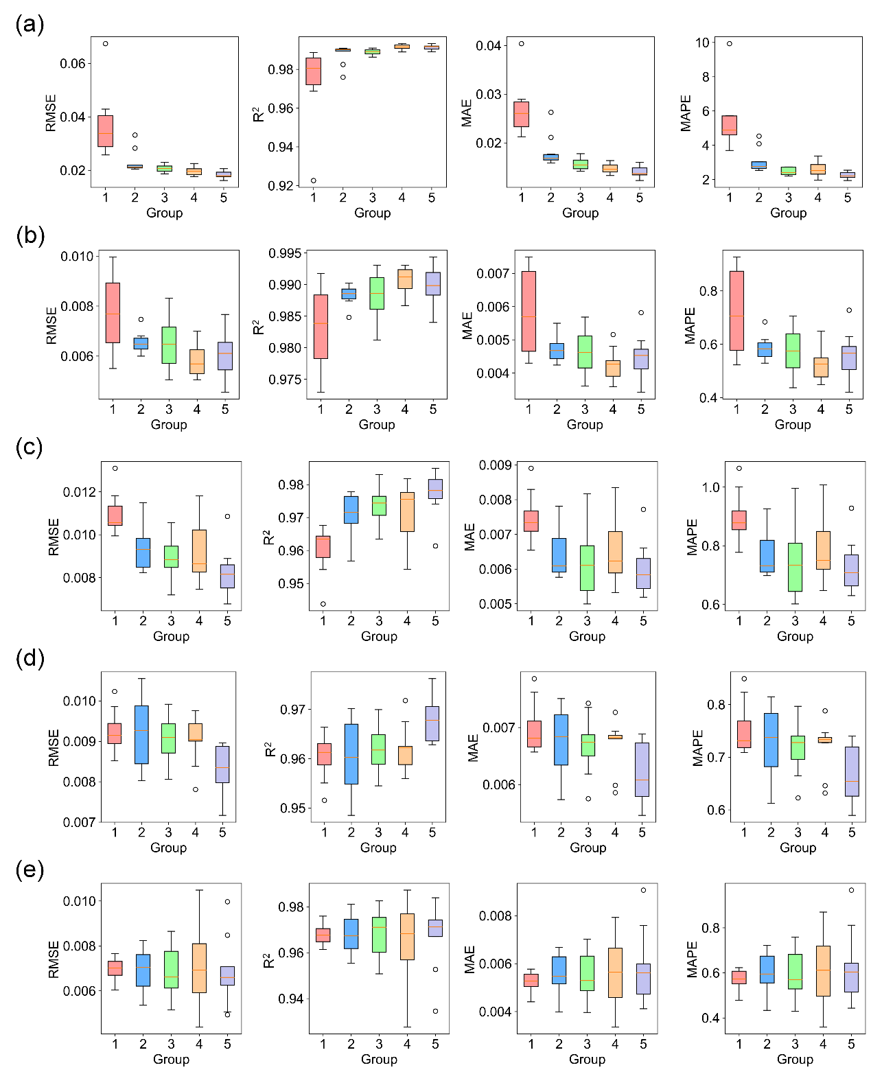 图2.不同电压窗口的模型误差分布。图(a)、(b)、(c)、(d)、(e)表示五种电池类型的误差分布箱形图。每个图由四个子图组成,每个子图对应一项评估指标:RMSE、R²、MAE和 MAPE。每个图中的五种颜色表示对应的五个电压窗口