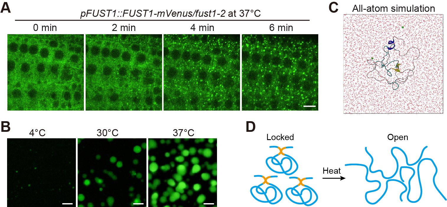图1.FUST1直接感受高温发生相分离。(A)植物细胞受到高温刺激后FUST1在细胞质中迅速发生相分离形成凝聚体;(B)FUST1体外相分离随着温度升高而增强;(C)全原子分子动力学模拟示意图;(D)FUST1的PrLD区域编码一个温度开关