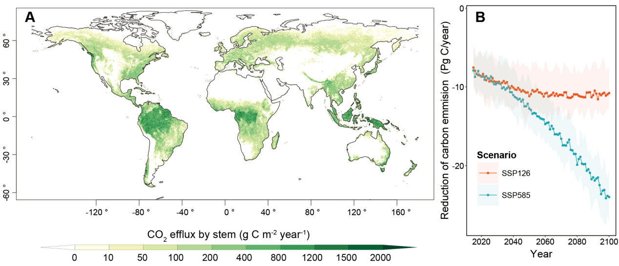 米兰milan官方网站地球系统科学系王焓副教授团队联合澳大利亚、英国、美国等多国科学家团队,构建了全球植物树干呼吸数据库,证实了树干呼吸存在普遍的热适应现象。根据生态演化最优性原理,研究首次独立预测出树干呼吸适应升温的热敏感性,并提出了水分粘滞阻力和蒸腾速率驱动调节全球树干呼吸时空变异的新理论。研究发现,到2100年,树干呼吸热适应有望降低陆地生态系统24%~46%的碳排放,这对于缓解气候-碳反馈有着极为关键的意义。