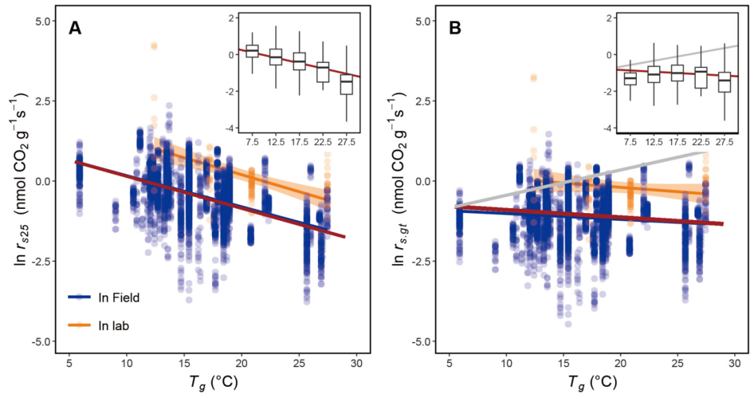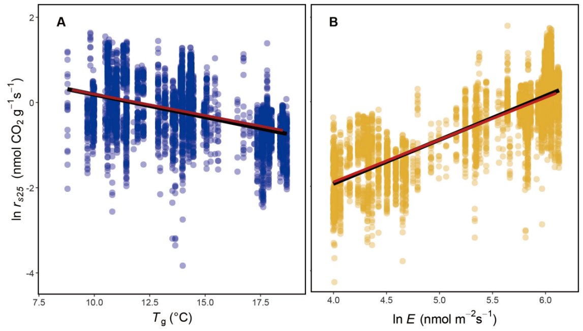 图1.参考温度和生长温度下单位质量树干呼吸速率(rs25,rs.gt)沿温度(Tg,日均温高于5˚C的生长季平均温度)梯度的变化。注:红色直线为理论预测结果,其他直线为观测拟合结果,呼吸数据取自然对数