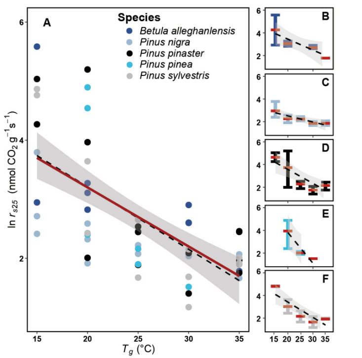 图3.增温实验中树干呼吸随生长温度的变化。注:红色直线为理论预测结果,其他直线为观测拟合结果,呼吸数据取自然对数