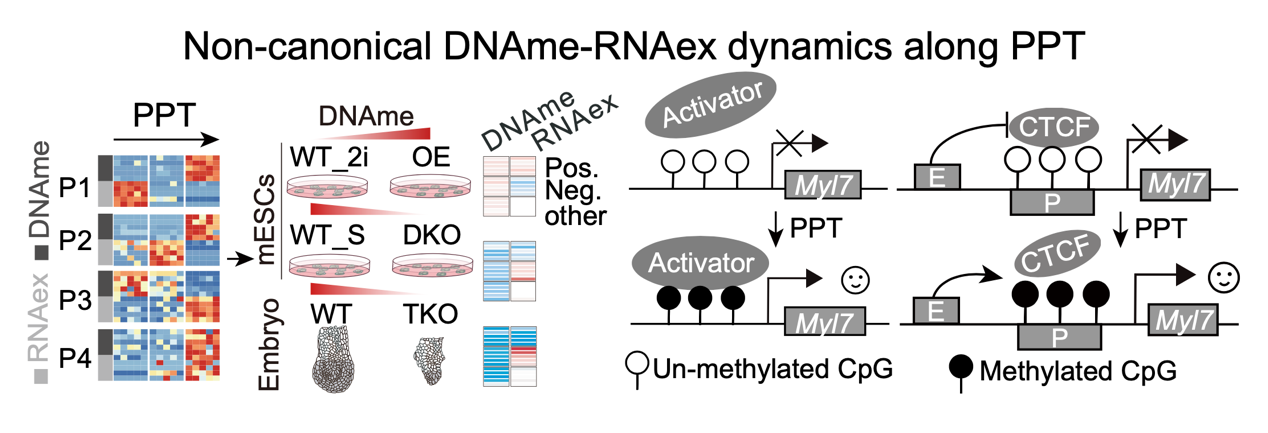 该研究揭示了围着床胚胎谱系特异的DNAme动态变化及VE亚群DNAme差异模式;解析了不同基因组元件上父母源DNAme差异的非同步消失规律;鉴定了围着床期启动子DNAme-RNAex的多样化动态模式,特别发现一类DNAme-RNAex正协同变化的非经典分子特征,为理解胚胎发育中表观遗传与基因表达的互作关系提供了新视角。