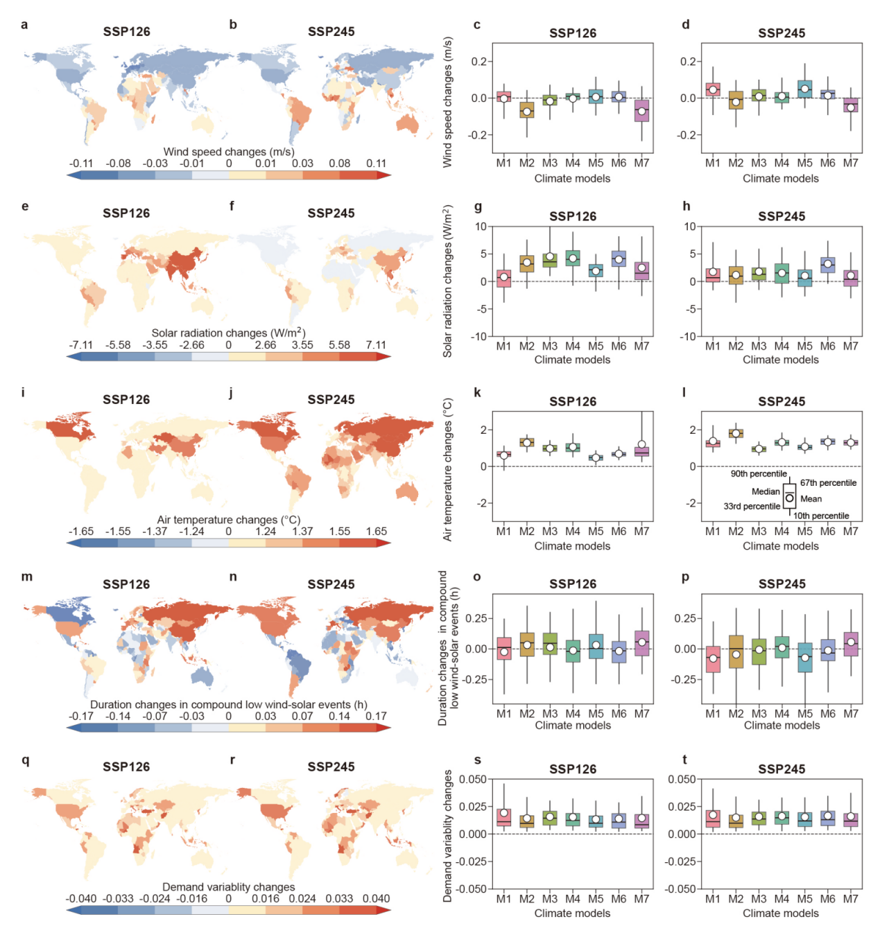 研究首先基于第六次国际耦合模式比较计划(CMIP6)多模式多情景数据集,量化了未来气候变化(2056–2060年与2016–2020年相比)对全球178个国家风光可用资源和电力需求的影响。在SSP1-2.6情景下,在未来全球地表气温增加的同时,全球平均地表风速将下降约0.02m/s,平均地表太阳辐射将增加约3.1W/m2。未来全球气象要素变化具有明显的空间异质性特征,例如中高纬度地区风速降幅更为显著,且气温增幅高于低纬度地区(图1)。研究发现,未来关键气象要素的变化将加剧高比例风光电力系统的供需矛盾,全球主要国家的电力系统将面临风光极低出力事件持续时长更长、电力负荷波动性增强的风险,而这一风险在地表风速降幅更大、气温增幅更高的中高纬度国家尤为突出。