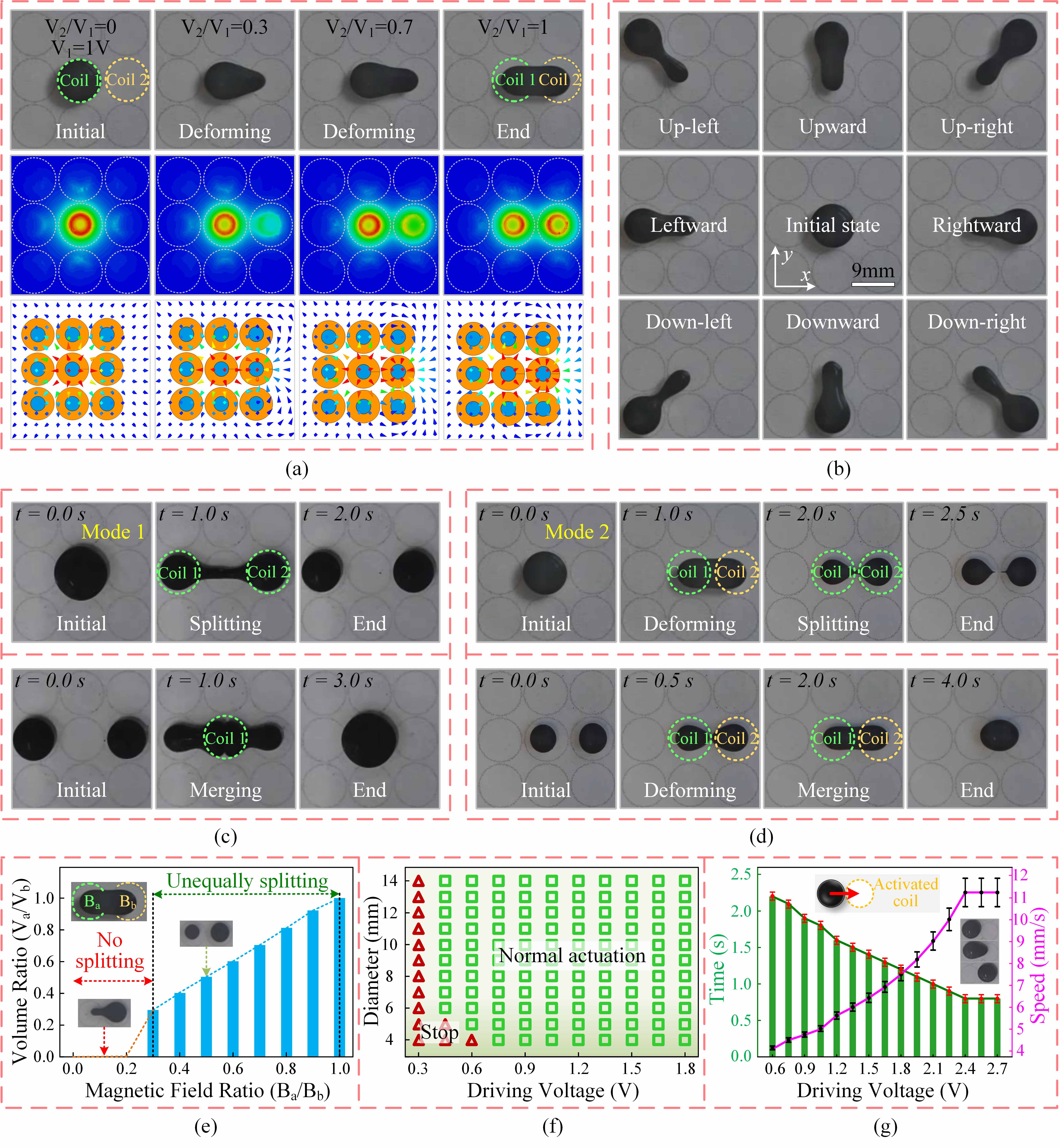 其次,团队深入探究了液滴机器人在局部磁场作用下的运动规律与变形机理。通过调节相邻线圈电流的方向与幅值,可以诱导液滴发生可逆分裂与合并。研究发现,当两个线圈施加方向相反的电流时,可驱动液滴产生拉伸形变;进一步调节磁场强度比,可精确控制分裂后的液滴体积比。此外,研究还揭示了液滴尺寸、电压强度与运动速度间的关系,为复杂操控提供了理论基础。