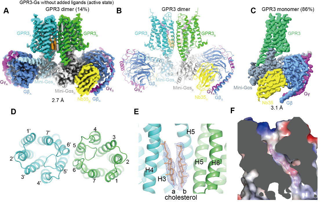 研究团队首先通过冷冻电镜技术,解析了GPR3与Gs蛋白复合物的活化态结构。在突变优化Gs偶联位点后,意外发现GPR3在同一样品中既以单体存在(86%),也形成清晰的二聚体结构(14%),后者分辨率达到2.7 Å。更为重要的是,研究者还获得了GPR3在非活化状态下的二聚体结构(3.32 Å)。结构分析发现,二聚化界面主要由TM5和TM6两条跨膜螺旋构成,并被两个胆固醇分子稳固包裹,形成一个典型的疏水界面(图1)。研究者进一步构建了一个无法形成二聚体的GPR3突变体,发现破坏二聚体界面可以显著增强Gs的偶联能力,这说明GPR3的二聚体形态实际上是一种功能抑制状态。这可能是一种天然的调控机制,用于在受体表达量过高时减弱其信号输出,防止过度激活。