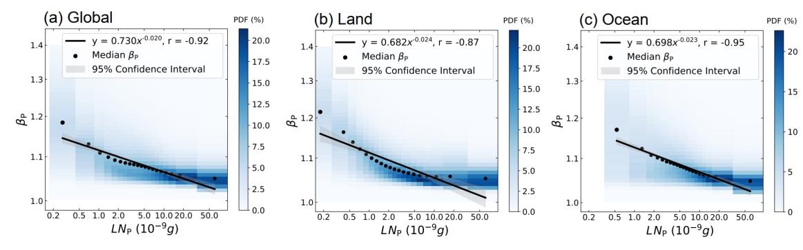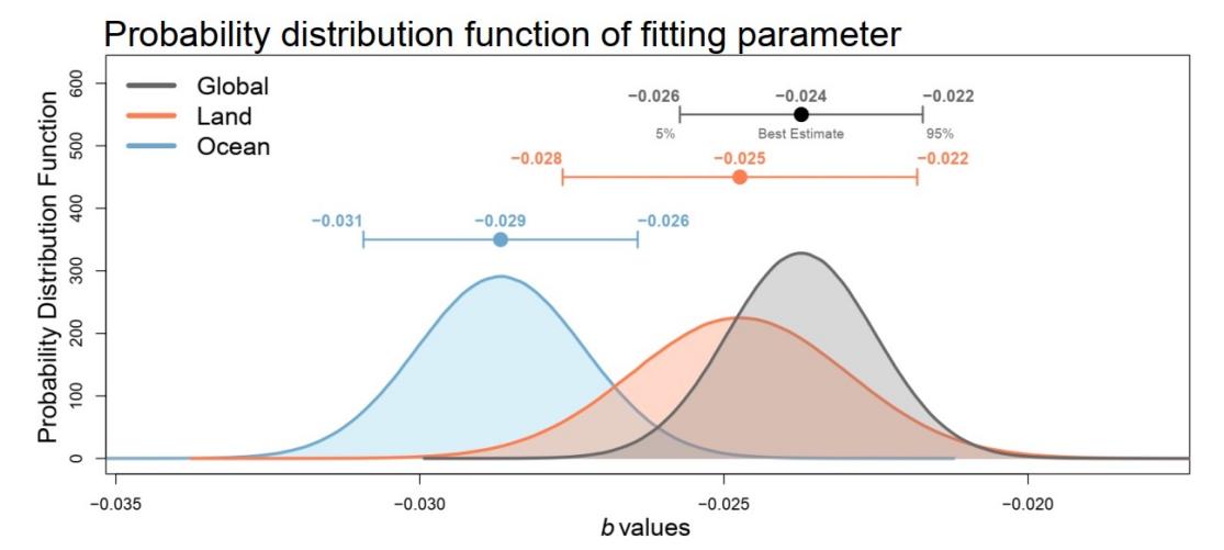 图3.用于计算离散效应的关键参数在全球、陆地和海洋的概率密度分布