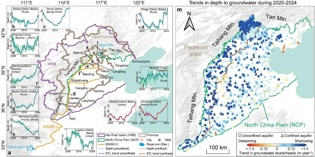 图1.华北平原及南水北调中线位置图(a)、典型监测井埋深序列(b-l)和2020~2024年各监测井地下水水位(水头)变化速率(m)