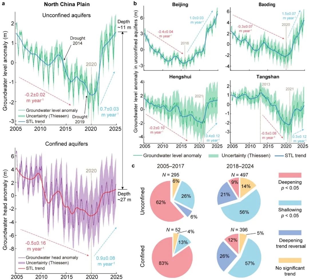图2.华北平原平均潜水水位和承压水水头距平(a)、典型城市(北京、保定、衡水、唐山)平均潜水水位距平(b)和不同埋深变化趋势的潜水与承压水监测井数量占比(c)