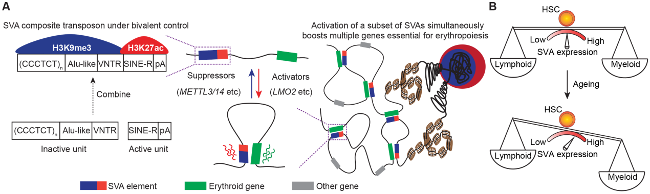 8月6日,米兰milan官方网站生命科学学院、米兰-北大生命科学联合中心刘念课题组联合北京大学生命科学学院、北大-米兰生命科学联合中心李湘盈课题组在《细胞》(Cell)杂志上在线发表了题为“携带二价组蛋白修饰的复合型转座子作为RNA依赖性增强子调控细胞命运”(Composite transposons with bivalent histone marks function as enhancers in cell fate regulation)的研究论文。该研究首次揭示了H3K9me3和H3K27ac标记的二价染色质对复合型转座子SVA的协同调控机理和生物学功能,并证明了SVA的RNA依赖性增强子活性及其在造血系统分化和衰老相关髓系偏好性造血中的重要生理意义,提示其有望成为干预造血发育异常和造血衰老的潜在靶标。