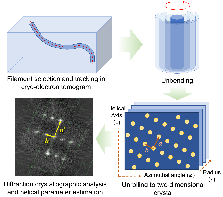 米兰新闻网8月12日电 螺旋组装体(helical structure)广泛存在于细胞环境中,在细胞形态维持、物质运输、信息传递等多种生物过程中扮演着重要角色,其三维结构的解析对于揭示相关的生物过程机制具有重要意义。螺旋参数的测定是实现螺旋结构三维结构解析的关键基础。目前常用的测定方法是层线法,通过对螺旋组装体电镜图像的功率谱中的线段状衍射图样进行测量与标定,以实现螺旋参数的解算。在实际应用中,冷冻电镜(cryo-electron microscopy, Cryo-EM)图像的极低信噪比(signal-to-noise rate, SNR)、螺旋组装体的柔性形变以及功率谱中的贝塞尔重叠(Bessel overlap)现象等问题,容易导致层线的模糊与偏移,使得该类方法的应用具有极大挑战性。此外,传统的层线法主要针对单颗粒图像设计,不适用于冷冻电子断层图像,制约了在原位结构解析中的应用。