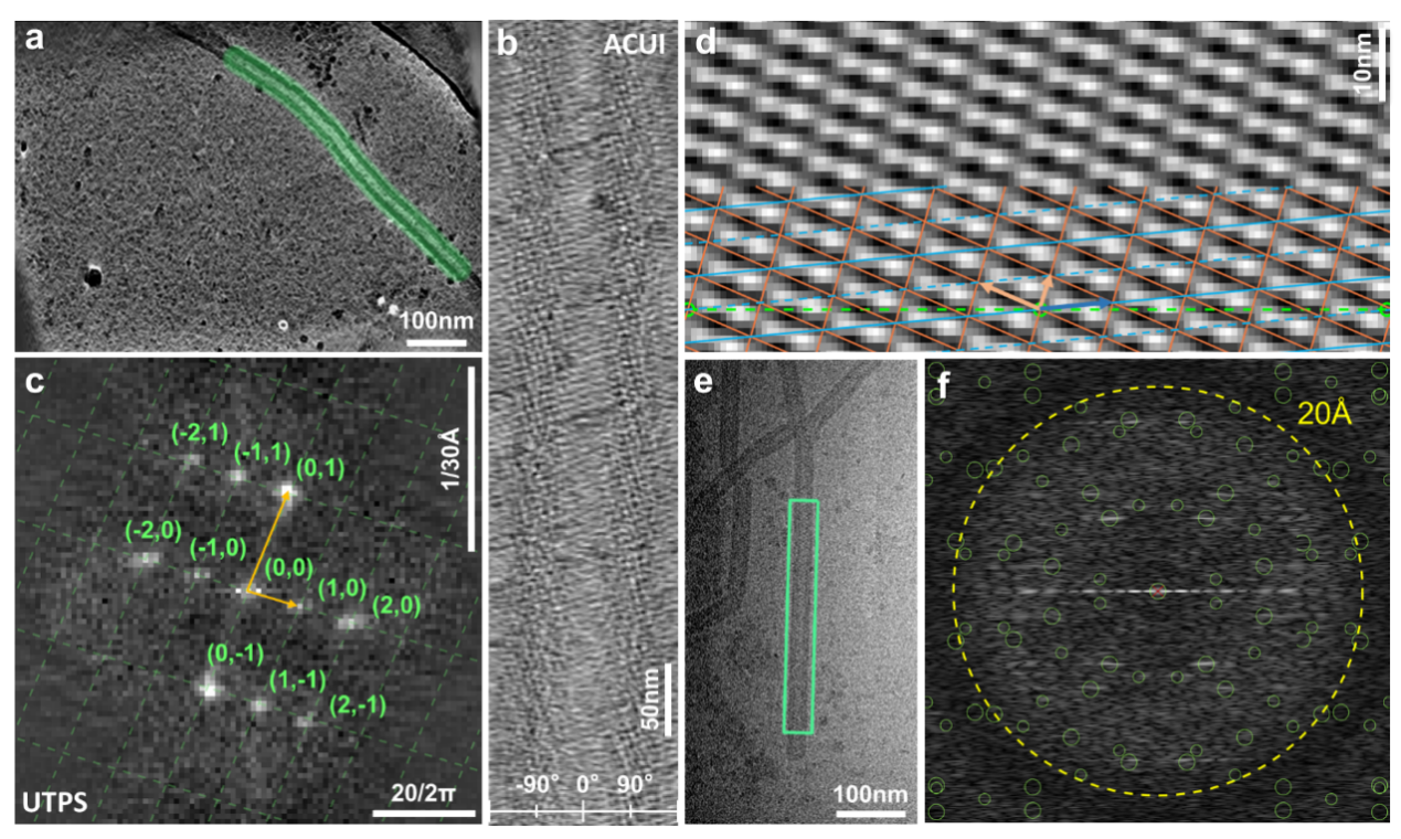 图2.LPOR膜管的实验结果。(a)某根LPOR膜管的断层图像截面;(b)LPOR膜管的平均柱面展开图像;(c)LPOR膜管的管状展开功率谱。橙色箭头指示选定的一对倒易基向量,绿色数字表示衍射点的指标;(d)(b)的对称平均图像;(e)LPOR膜管的单颗粒图像;(f)LPOR膜管一段区域((e)中绿色框)的功率谱;在(b)和(c)中,水平方向和垂直方向的长度单位不同,两个方向分别提供比例尺