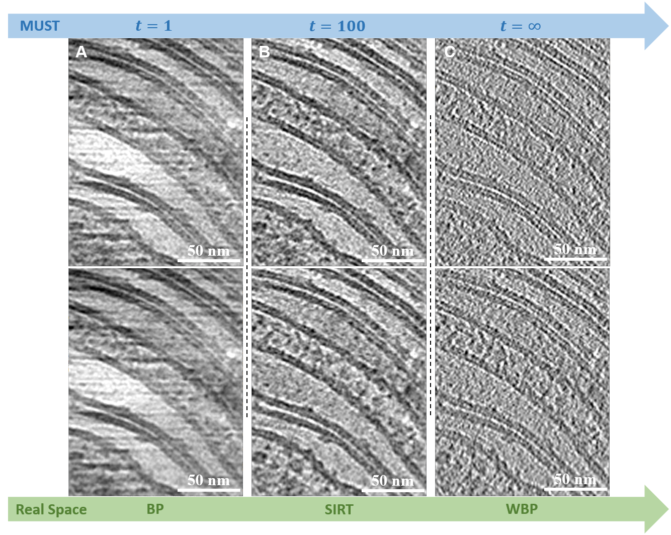 测试表明,MUST可以实现无混叠重建,消除了由于实空间重建方法的插值误差所引入的反折条纹,以及由于实空间三维衬度传递函数校正对于离焦量梯度的离散化所引入的条纹(图3)。进一步的子断层平均实验表明,MUST通过消除傅里叶空间中的混叠,相比实空间重建方法可以获得更高分辨率的蛋白质重构结果(图4)。