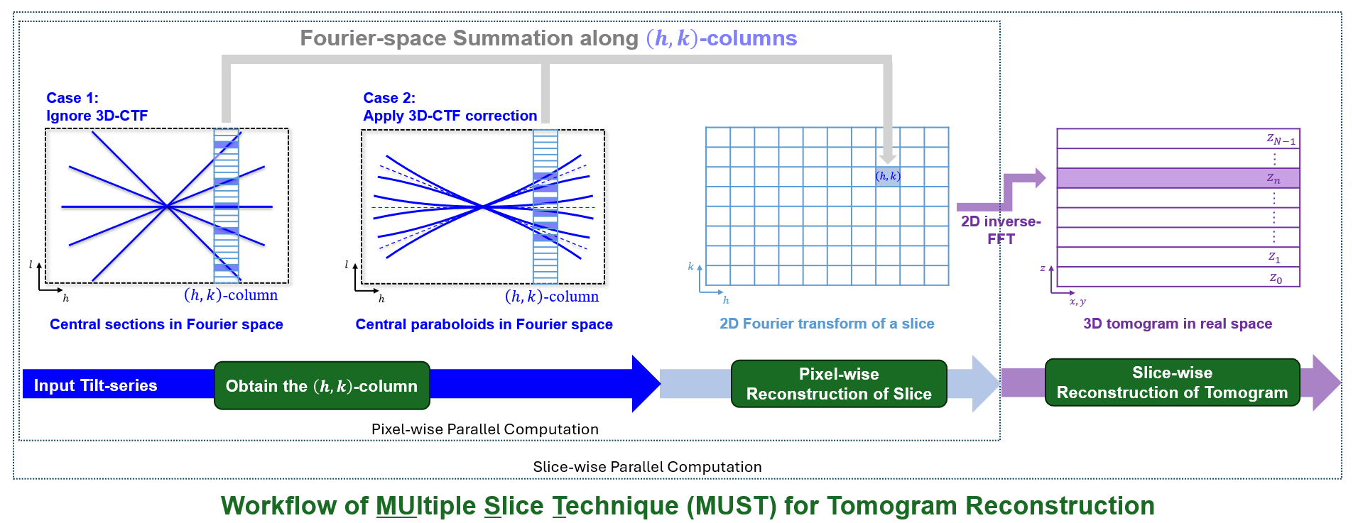 近日,米兰milan官方网站生命学院李雪明副教授课题组和电子系沈渊教授课题组联合在《超显微镜》(Ultramicroscopy)在线发表题为“基于傅里叶空间的冷冻电子断层成像多层重建方法”(Fourier-based multiple-slice reconstruction in cryo-electron tomography)的研究论文。论文报道了一种基于傅里叶空间的冷冻电子断层成像三维断层重建方法MUST(MUltiple Slice Technique,图1)。该方法将三维重构密度图看作是由一系列平行平面层(parallel slice,PS)组成的,通过逐层独立计算的方法来合成最后的三维图像。而对于一个平行平面层的计算是通过在傅里叶空间按像素列投影计算得到的。由于像素列的计算是互相独立的,可以实现像素级的并行计算。由此形成实空间平面级并行与傅里叶空间像素级并行的两级并行架构,可大幅提升重建效率。通过对傅里叶空间中频点的相应加权操作,MUST可以获得与基于实空间的WBP和SIRT方法衬度相似的重构结果(图2)。研究团队同时发现,在考虑样品离焦量梯度(defocus gradient)的三维衬度传递函数校正(three-dimensional contrast transfer functioncorrection,3D-CTF correction)中,傅里叶空间中的平面状的中心截面会劈裂为一对中心共轭抛物面(pairs of conjugate central paraboloids, PCCP)。