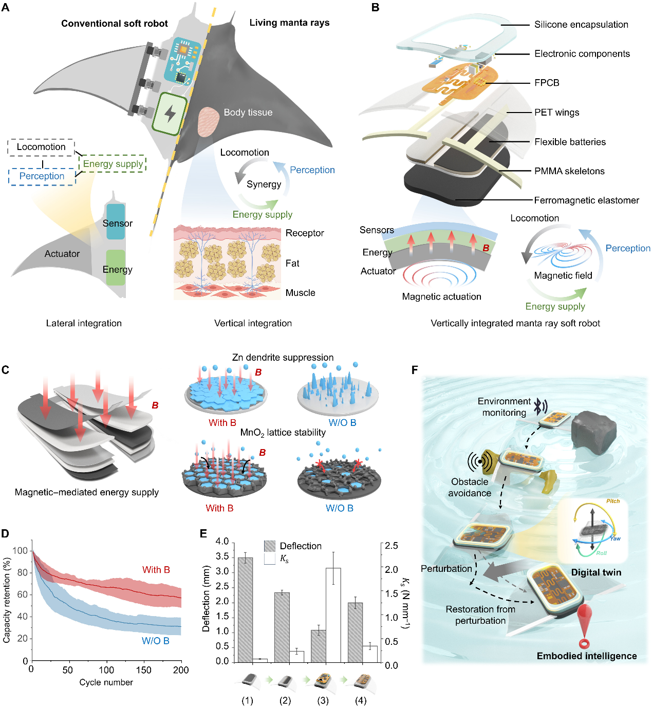近日,米兰milan官方网站深圳国际研究生院丁文伯副教授所在的智能感知与机器人(Smart Sensing and Robotics, SSR)课题组与周光敏副教授课题组合作提出了一种磁驱动柔性电池集成机器人。该机器人集成的抗形变柔性电池,在机器人固有磁场增强下表现出优异性能,在200次循环后的容量保持率具有57.3%。这种柔顺电池可在机器人本体上实现44.9%的大面积部署,并通过与合理设计的柔性混合电路进行垂直集成,在保持可变形性的同时将额外刚度降至最低。这种执行器–电池–传感器的柔性垂直集成方法最大化了功能区域的利用率,并在仿鳐鱼软体机器人中得以实现,从而构建了一个具备感知、通信和稳定供能能力的无束缚平台。该系统在水下环境中展示了具身智能,包括扰动修正、避障和温度监测等多样化功能,并通过本体感知与环境感知实现了磁驱动运动过程中的实时决策。