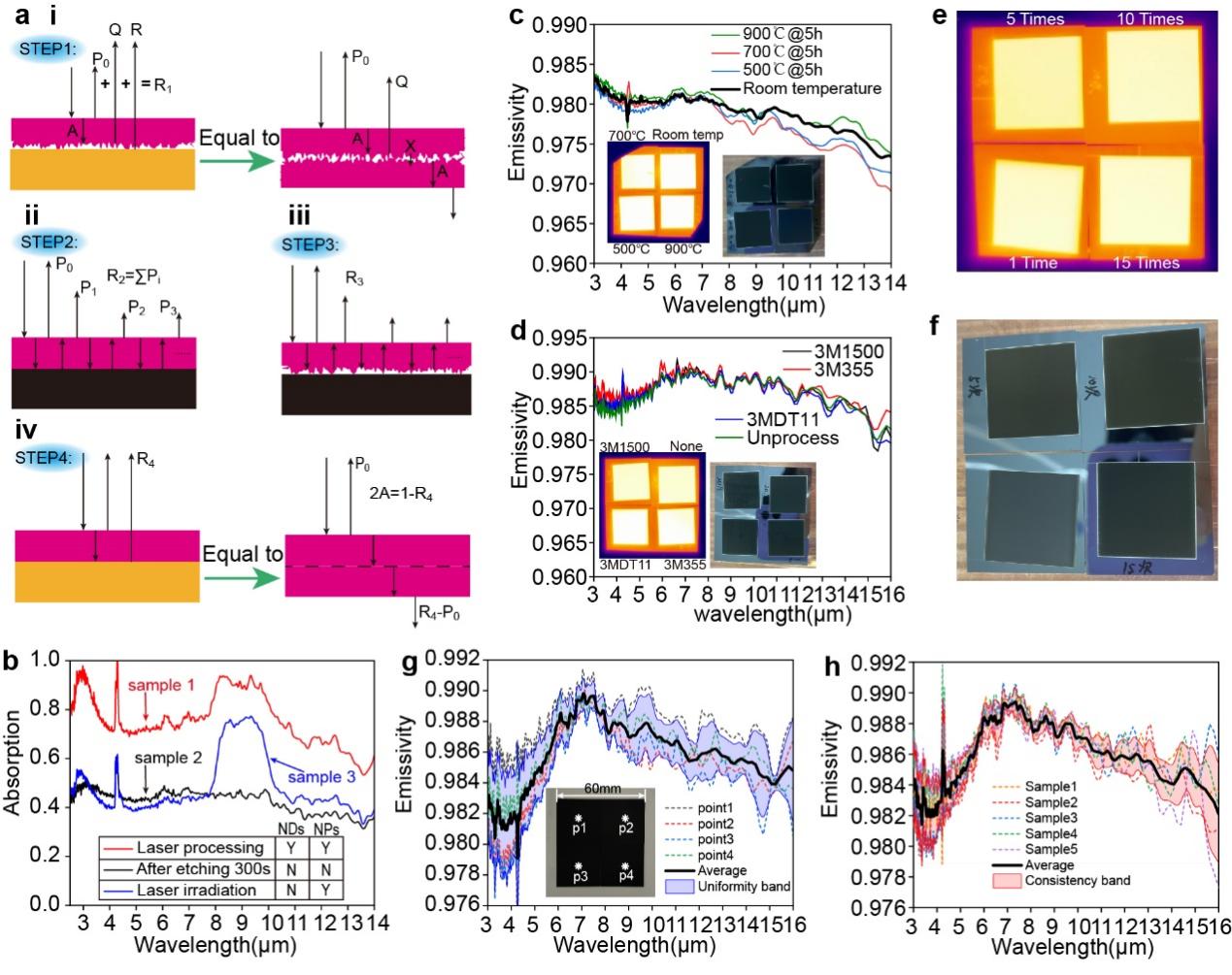 这种由米兰milan官方网站团队原创的面源黑体生成原理和制备技术对于高性能面源黑体发展具有里程碑意义,解决了长期制约面源黑体发展的涂层脱落、耐久性差等关键难题。实验测试表明,这种面源黑体展现出了一系列先进技术性能指标:在3~14微米超宽红外波段内实现了优于98%的发射率,在0~70°宽角度入射下可实现近乎完美的宽带光吸收;具有很好的温度稳定性,在超过900℃的高温环境中工作仍能够保证发射率的稳定;具有很好的耐久性,通过老化试验表面可保证至少工作10年而发射率没有明显下降;具有很好机械稳定性,能够在至少20次、不同粘度的胶带循环剥离实验中保持结构完好且没有明显的发射率下降;具有很好的一致性,在60×60mm2的大面积样品表面发射率均匀性偏差优于0.25%,制备的多个样品的性能可重复性偏差优于0.15%。这些性能保证了这种新型面源黑体可在恶劣环境下的多种红外应用场合具有突出优势。
