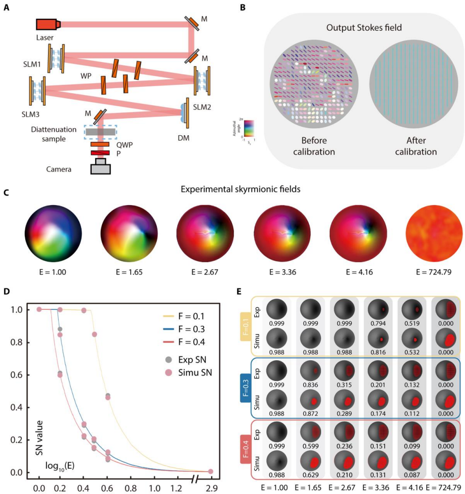 传统光学元件和样品本身导致的偏振衰减(diattenuation)与相位延迟(retardance)严重影响了偏振测量的准确性。特别是长期被忽视的偏振衰减像差,即衰减器选择性吸收特定偏振分量,引起不可逆的光强损失和偏振态失真,极大限制了传统偏振校正技术的效果。何宏辉、何永红团队及其合作者提出以光学斯格明子作为偏振态探针,利用其偏振分布覆盖整个庞加莱球、可同时对光学系统的偏振响应进行全局采样与评估的特点,极大提升了偏振像差的探测、系统校正的效率和鲁棒性。该新型偏振光学测量技术有望实现对偏振场的全域、动态和高精度控制。